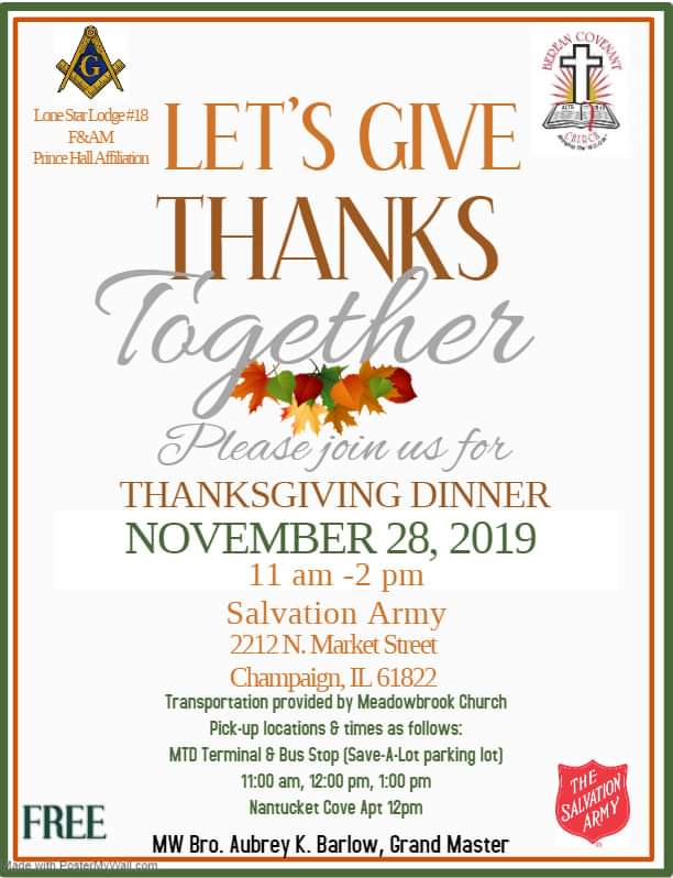 With that noted, if you are looking to celebrate the holiday with others in the community the Salvation Army is providing a dinner from 11:00 a.m. until 2:00 p.m. on November 28. For more information, please review the flyer for the event.